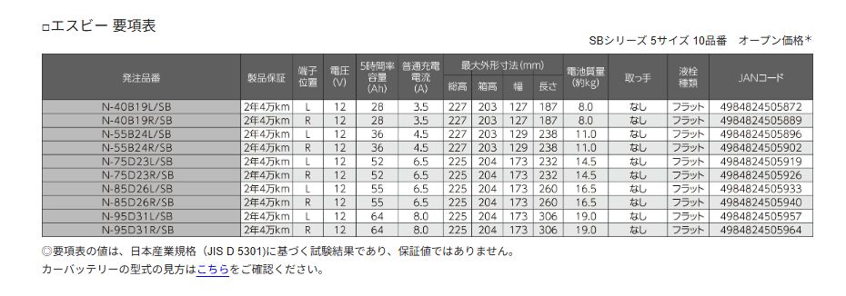 □商品説明(N-40B19R/SB)極板に「カルシウム合金」を採用することで、メンテナンス性を向上