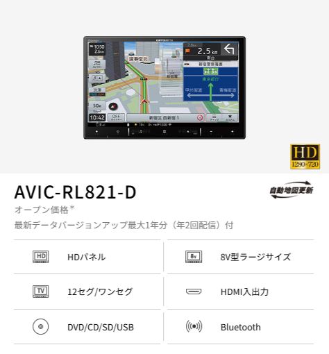 AVIC-RL821-D Pioneer パイオニア 8V型HD/TV/DVD/CD/Bluetooth/SD/USB/チューナー・AV一体型メモリーナビゲーション