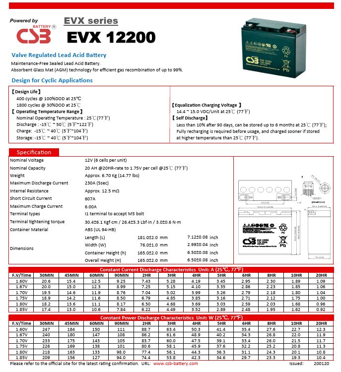 EVX12200 小形制御弁式密閉形鉛蓄電池 12V-20Ah CSB サイクルバッテリー